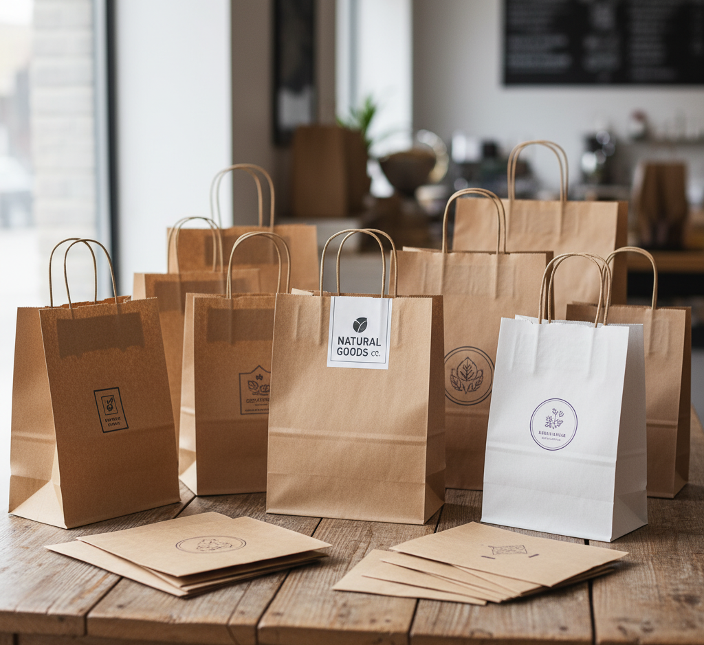 Eco-friendly paper bags in various sizes and designs for retail and food packaging needs.